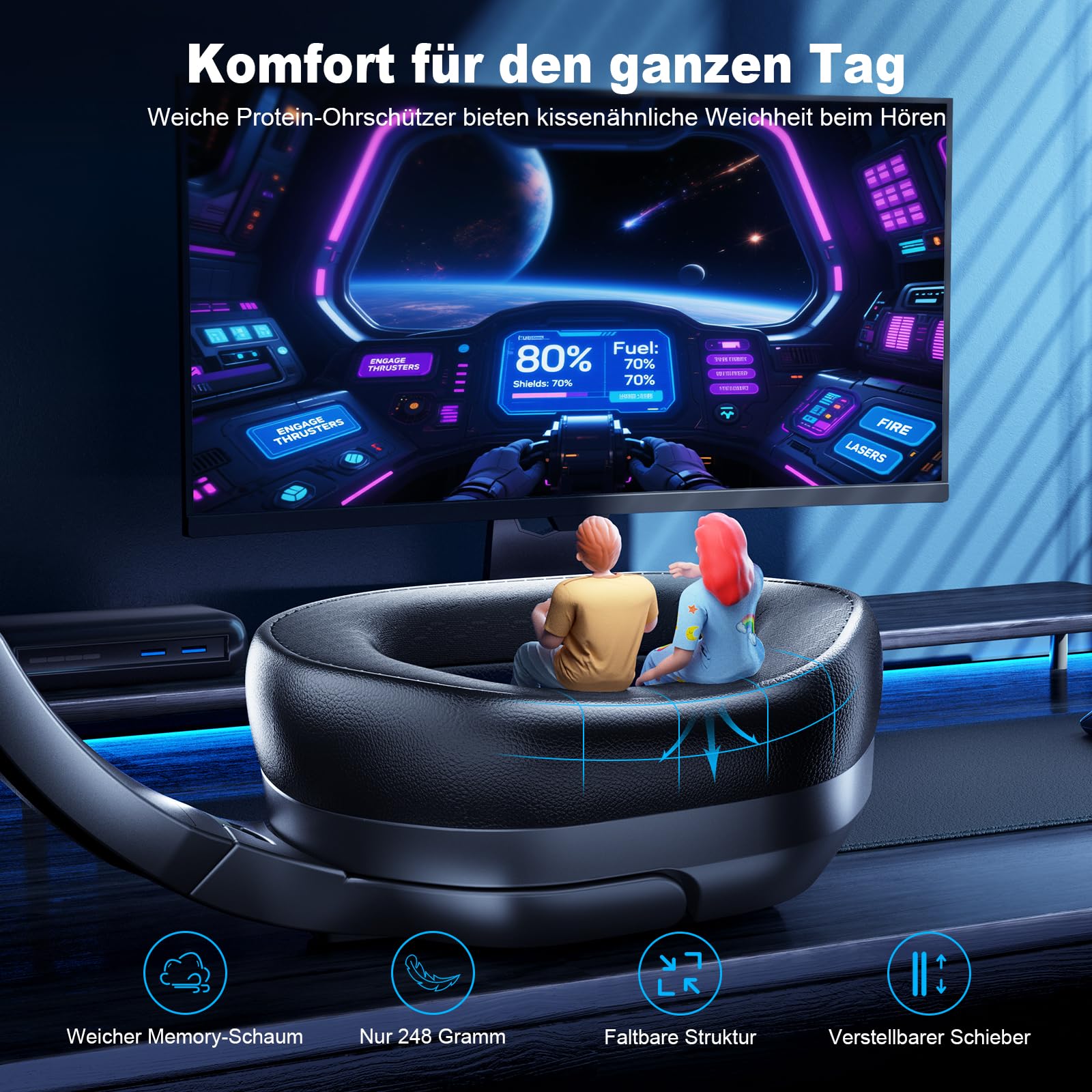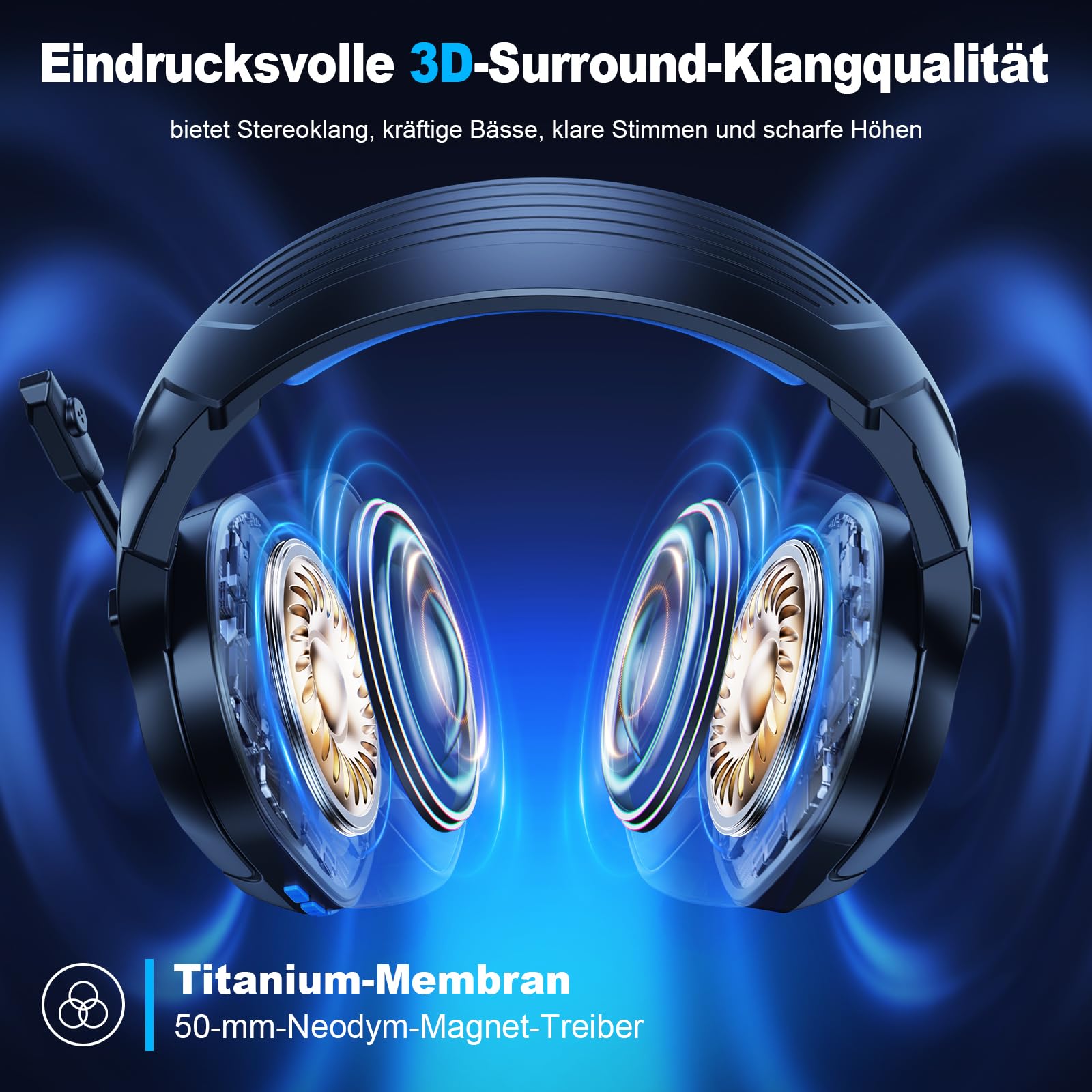 2.4 GHz-Funk (≤ 20 ms) + Bluetooth für flexibles Umschalten. 50 mm-Treiber liefern druckvollen, präzisen Stereo-Sound. Bequem, leicht, Akku für lange Sessions.