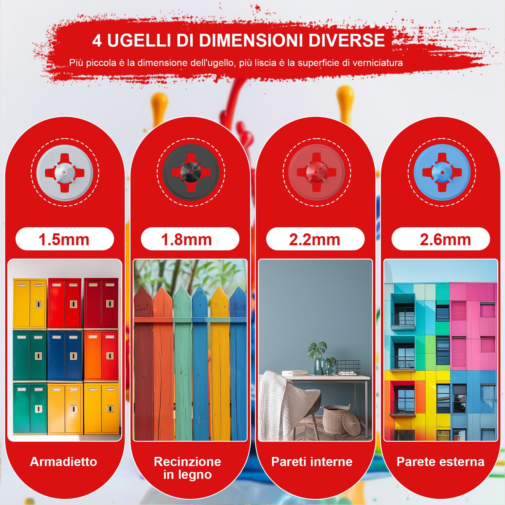 • 3 Sprühmuster (horizontal / vertikal / rund) und 4 Düsen (1,5 / 1,8 / 2,2 / 2,6 mm) für präzise Kanten UND große Flächen ⚡️